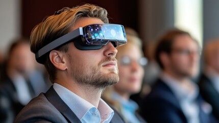 Innovative technology conference with man using augmented reality glasses