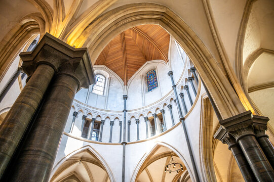 London, UK - August 20, 2022: Impressive Temple Church in the City of London. Temple Church was built by Templars in the 12th century and is a popular destination.