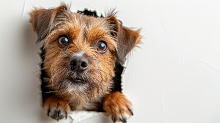 A small brown dog with an inquisitive expression popping through a freshly created hole in a white wall, paws up and eyes wide open, making a playful and fun image.