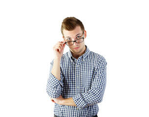A young man wearing a blue checkered shirt, adjusting his glasses, isolated on a white background. Concept of thoughtful or inquisitive expression