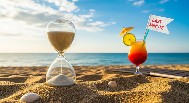 Hourglass on sand on beach with sea, cocktail nearby in background with inscription "Last minute", sale of summer vacation offers, vacation travel, tourism, travel agency, background concept