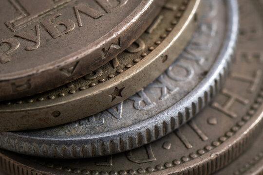 Stacked various coins close up, uncirculated coins with corrosion, dents and scratch damage, edges are reeded, decorated and with inscription