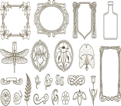 A collection of vintage ornate frames decorative elements botanical illustrations and insect sketches in sepia tones