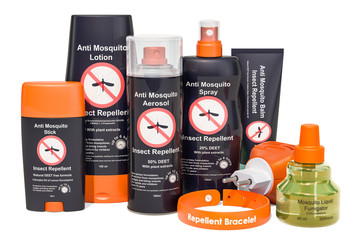 Mosquito repellent. Woman using insect repellent spray outdoors.