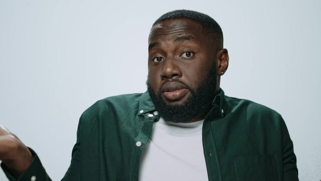 Young Asian woman in white t-shirt, studio shot, shrugs shoulders and open eyes confused.