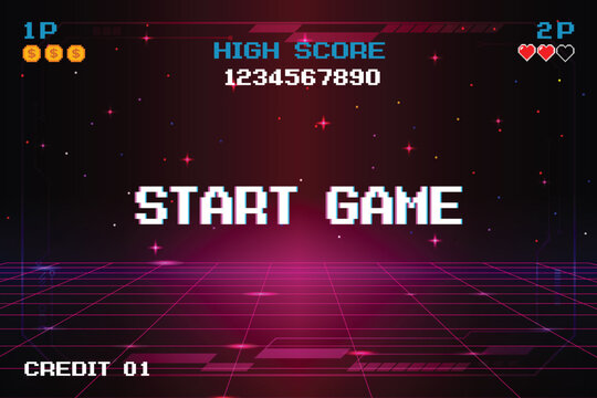 START NEW GAME play .Synthwave wireframe net illustration. pixel art .8 bit game. retro game. for game assets .Retro Futurism Sci-Fi Background. glowing neon grid. and stars.