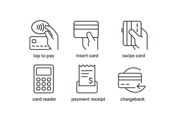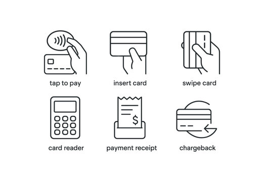 simple outline stroke icon isolated on white background: tap to pay insert card swipe card card reader payment receipt chargeback