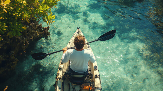 Exploring serene tropical inshore flats by kayak under bright sunlight