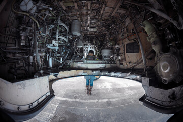Professional female golfer holding club playing golf indoors on golf simulator concept