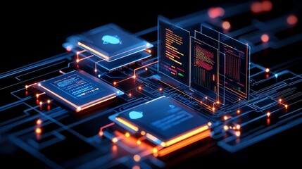 Digital network architecture showcasing futuristic technology in a virtual environment with insightful data visualizations