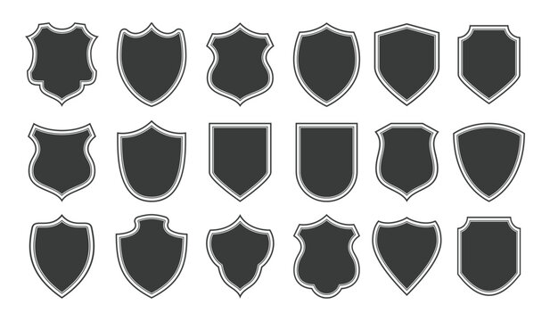 Shields icon set. Collection of security shield icons.  Police badge shapes with contours and linear signs. Vector military shield silhouettes.