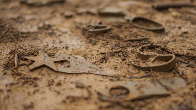 insignia. Crushed military insignia lies in mud amid scattered footprints, earthy tones. ESG reports, sustainability campaigns, designed for environmental awareness campaigns.