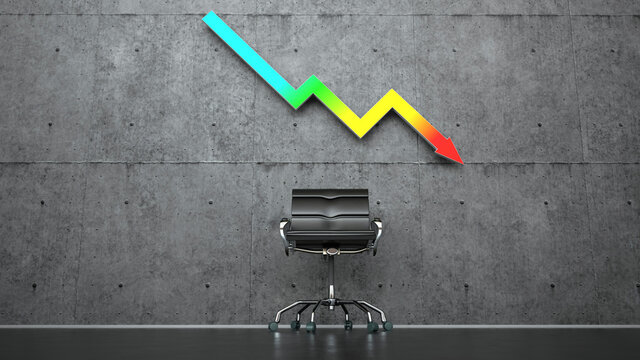 Three dimensional render of office chair standing under colorful graph arrow representing economic recession