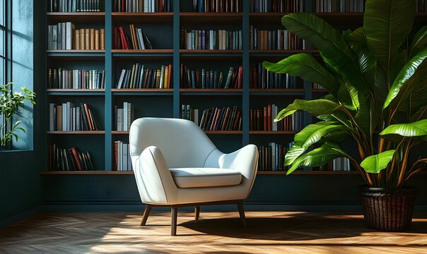 Cozy reading corner with a comfortable armchair and a lush bookshelf backdrop
