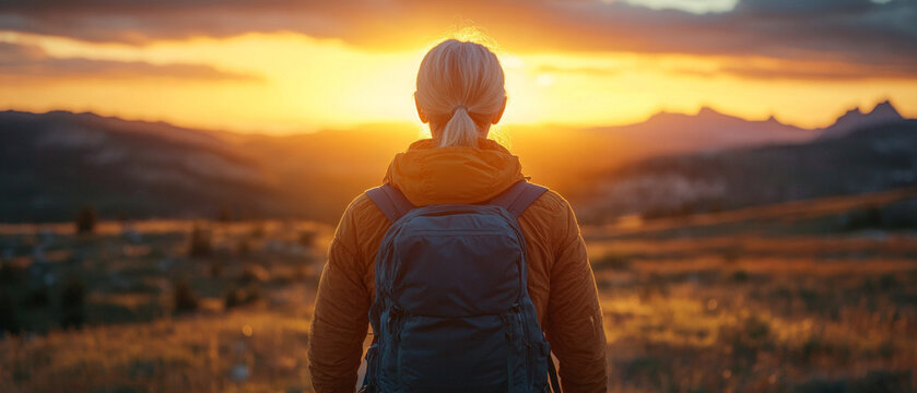 The silhouette of a person with a backpack against the backdrop of mountains and sunset conveys the spirit of travel and freedom, fitting perfectly into the background
