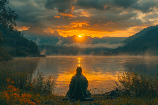 People enjoying nature. Woman sitting on a hill watching the sunrise.