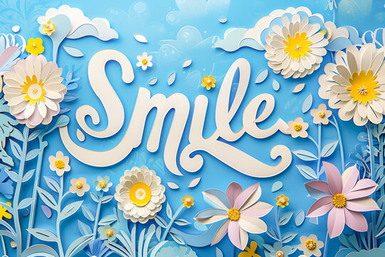 Blue text Smile on a pastel blue background with flowers