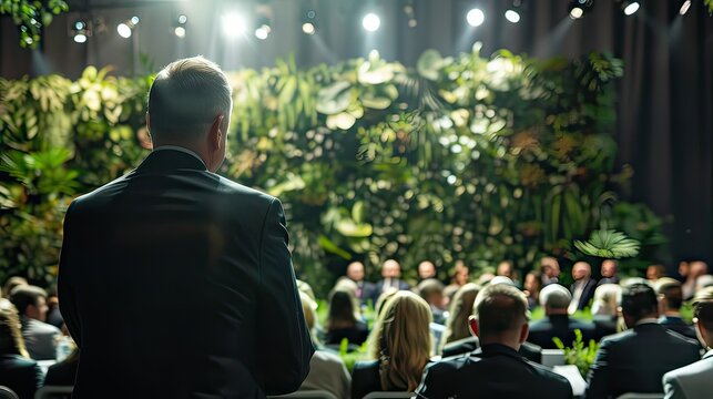Businessman silhouette delivering a motivational speech at an inspirational conference event