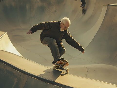 An AI-generated depiction of an adventurous senior demonstrating his skateboarding skills at a local skate park, onlookers