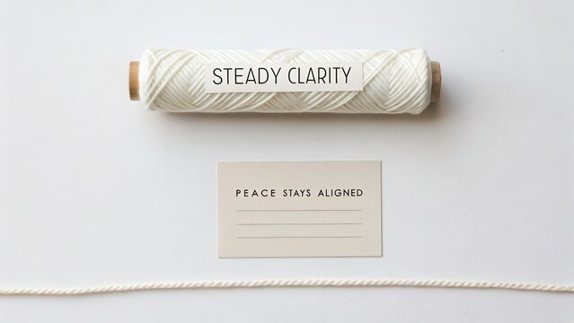 Neutral background with white twine and motivating card highlighting message of clarity and peace for inspirational themes