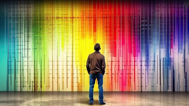 AI generated illustration of a man in front of a vibrant abstract wall mural