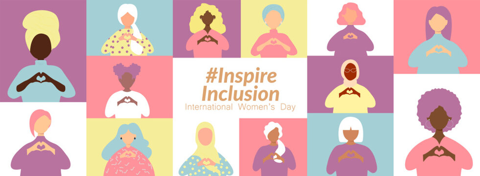 International Women s Day. Diverse women with heart-shaped hands stand together. Campaign 2024 inspireinclusion