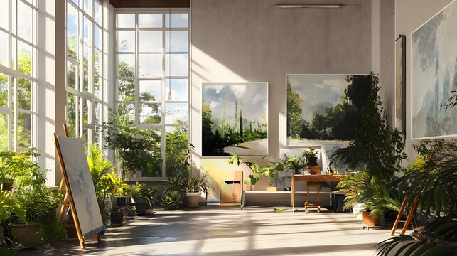 An open art studio showcasing an inspiring environment with large windows, plants, and unfinished artworks adorning the walls