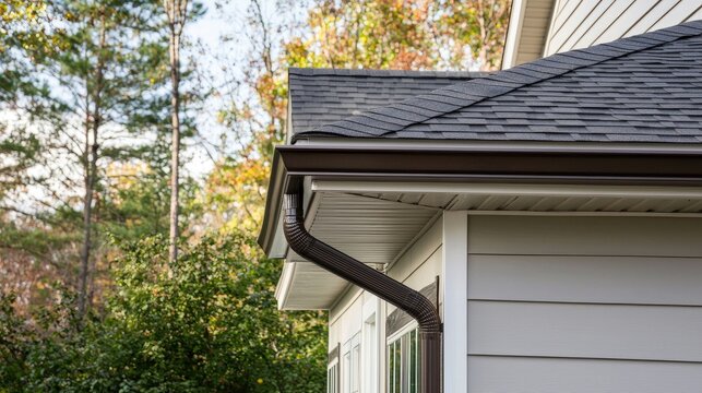 Gutter system installed on a modern house with a sloped roof surrounded by trees in early autumn light