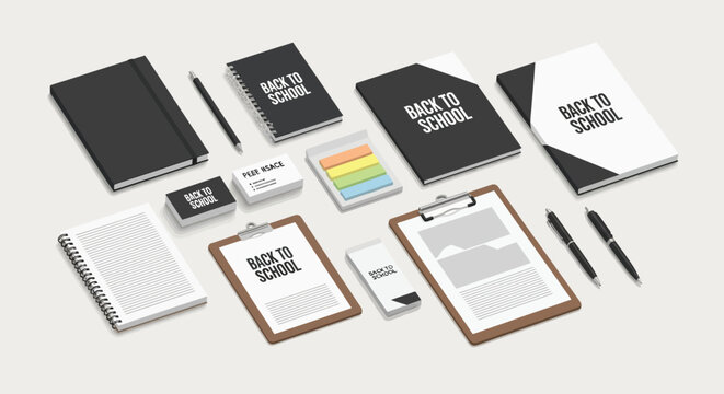 Back to school supplies stationery mockup notebook pen clipboard business card post it note branding design 3d