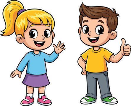 Cartoon boy and girl standing side by side, smiling, waving and thumbs-up gesture, friendly kids vector illustration for education content