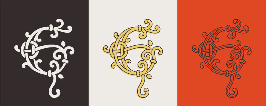 Celtic G monograms set. Insular style initial with authentic knots and interwoven cords. British, Irish, or Saxons overlapping monogram.
