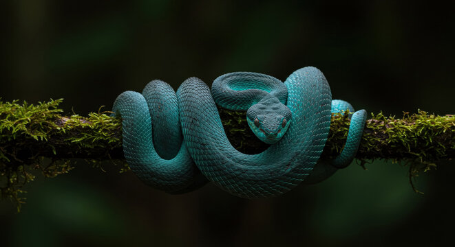 Blue Island Pit Viper Coiled on Mossy Branch with Intense Stare