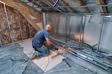 Closeup of a small model house wrapped in a warm woolen scarf above a white radiator. Cold protection, home insulation, space heating system, energy crisis concept.