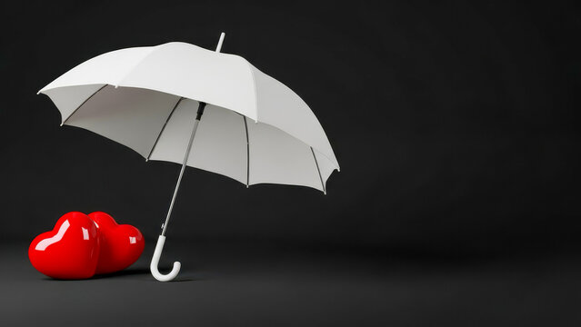 White umbrella protecting two red hearts on black background love care safety insurance and Valentine Day concept