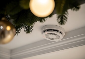 Modern domestic smoke detector mounted on a white ceiling next to blurred Christmas greenery, promoting fire safety and home security during holiday celebrations, essential for insurance