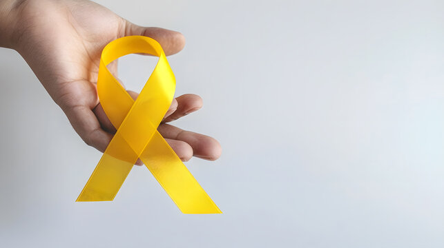 Hand holding Yellow ribbon on white background copy space Bone cancer Sarcoma Awareness childhood cancer cholangiocarcinoma gallbladder cancer world Suicide Prevention Day Health conce : Generative AI