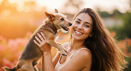 Happy brunette woman holding small mixed breed dog with golden sunset lighting outdoors. Pet bonding and friendship for veterinary services and pet insurance campaigns