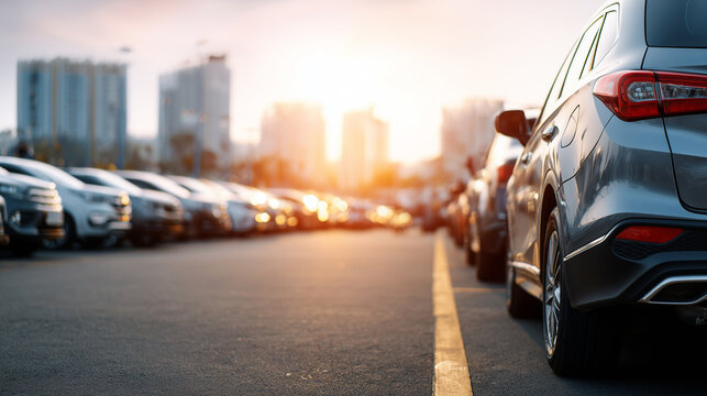 Car parked at outdoor parking lot. Used car for sale and rental service. Car insurance background