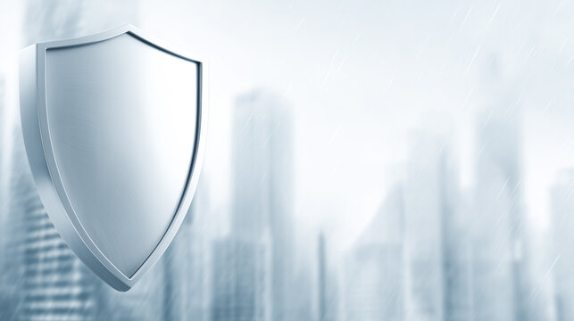 Advertising banner featuring a metal shield against a blurred cityscape, symbolizing protection, reliability and insurance security.