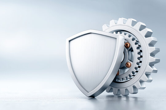 Industrial protection concept with neatly arranged gears and metal components featuring an insurance shield symbol, representing safety, risk management, and industrial coverage.