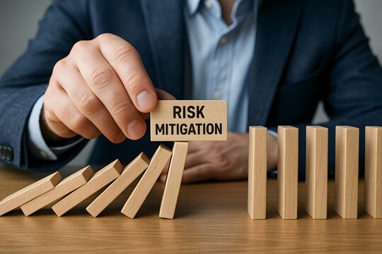 Conceptual display Risk Mitigation. Business showcase strategy to prepare for and lessen the effects of threats