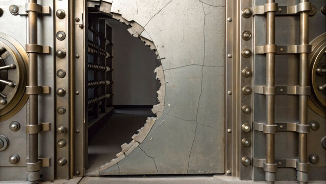 Large hole in steel bank vault door highlights critical security breach with significant economic risk and sense of urgency in empty interior
