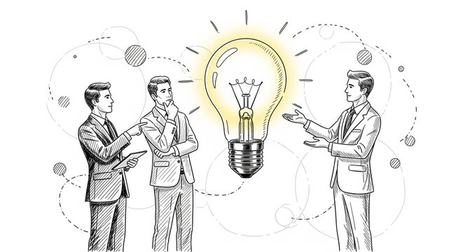 Businessmen brainstorm a new idea, depicted as a glowing light bulb, showcasing innovation, creativity, and collaboration in a hand-drawn business illustration.