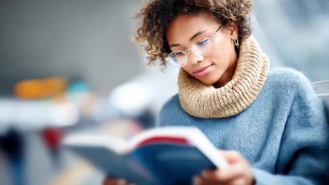 Focused Reader: A woman wearing glasses reads a book attentively, embodying intellectual curiosity, knowledge, and the serene act of engaging with literature.
