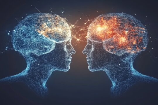Love psychology Digital illustration of a couple with glowing brains symbolizing the vibrant exchange of ideas and intellectual energy in their connection