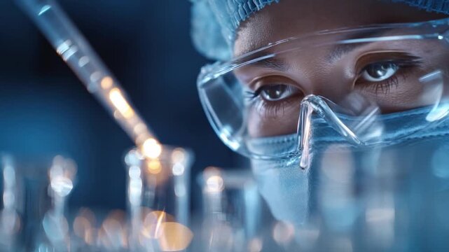 Precision in the Lab: A focused scientist, clad in a crisp lab coat and protective eyewear, meticulously examines a collection of vials, embodying scientific rigor and dedicated research.