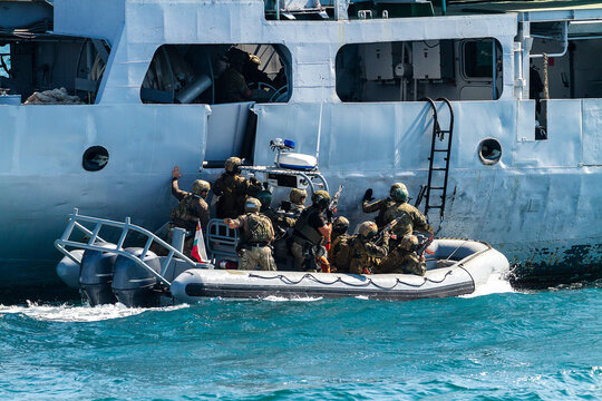 Military soldiers boarding ship for control and search for refugees on ship deck during operation on sea.