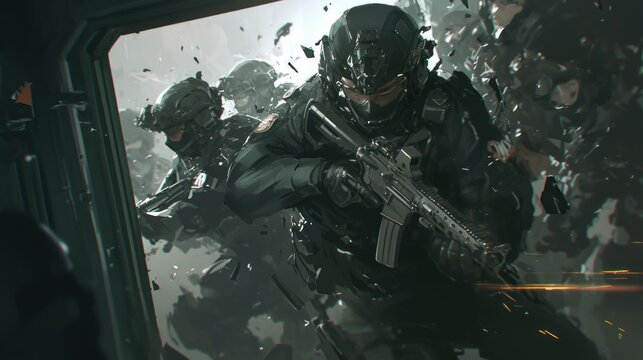 Silhouettes of soldiers emerging through thick smoke, highlighting the tension and readiness of a security or military operation in a foggy, blue-tinged environment.