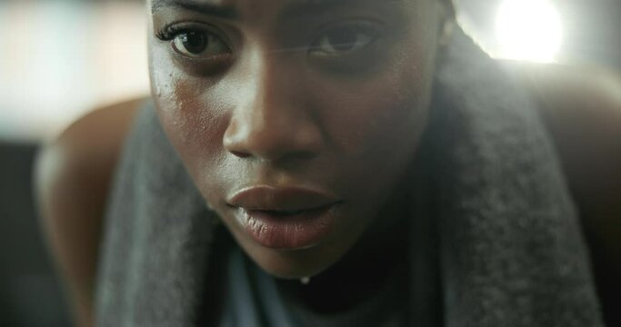 Gym, training and tired black woman breathing after exercise, workout and sports fitness. Woman in a health and wellness club breathe and relax after intense athlete challenge with focus