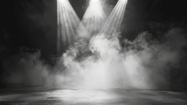 White smoke billowing across a stage with a spotlight shining in the background, creating a dramatic atmosphere for theater productions, concerts, and special events